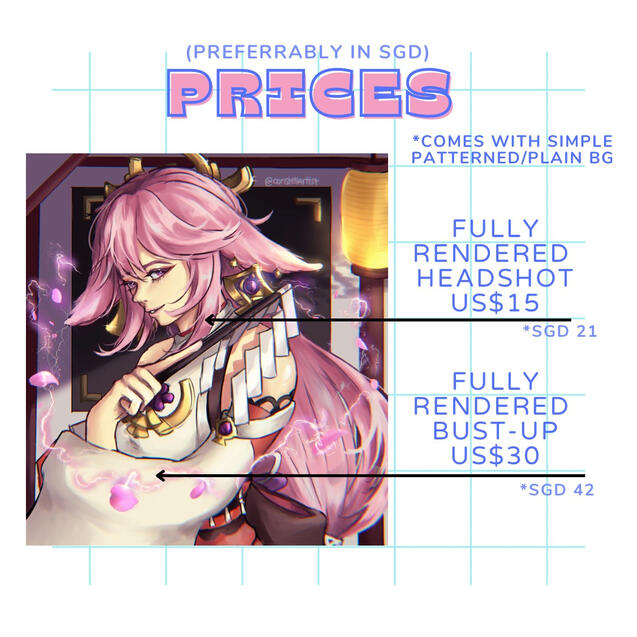 - Special effects + Unique backgrounds e.g. in Heizou [power effects], Ayato [sword effects + water bg] and Yae [electro sakura effects + shrine bg] samples used above (US$3/S$4) (Take note: simple patterned backgrounds and flat colour backgrounds come free)